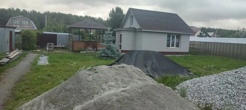 Территория огорожена забором из профнастила с трех сторон и живой изгородью из кустов. Есть современная беседка, хоз. блок, На учвстке свежий газон, голубая ель, вишня, красная, белая и черая смородина, яблоня.